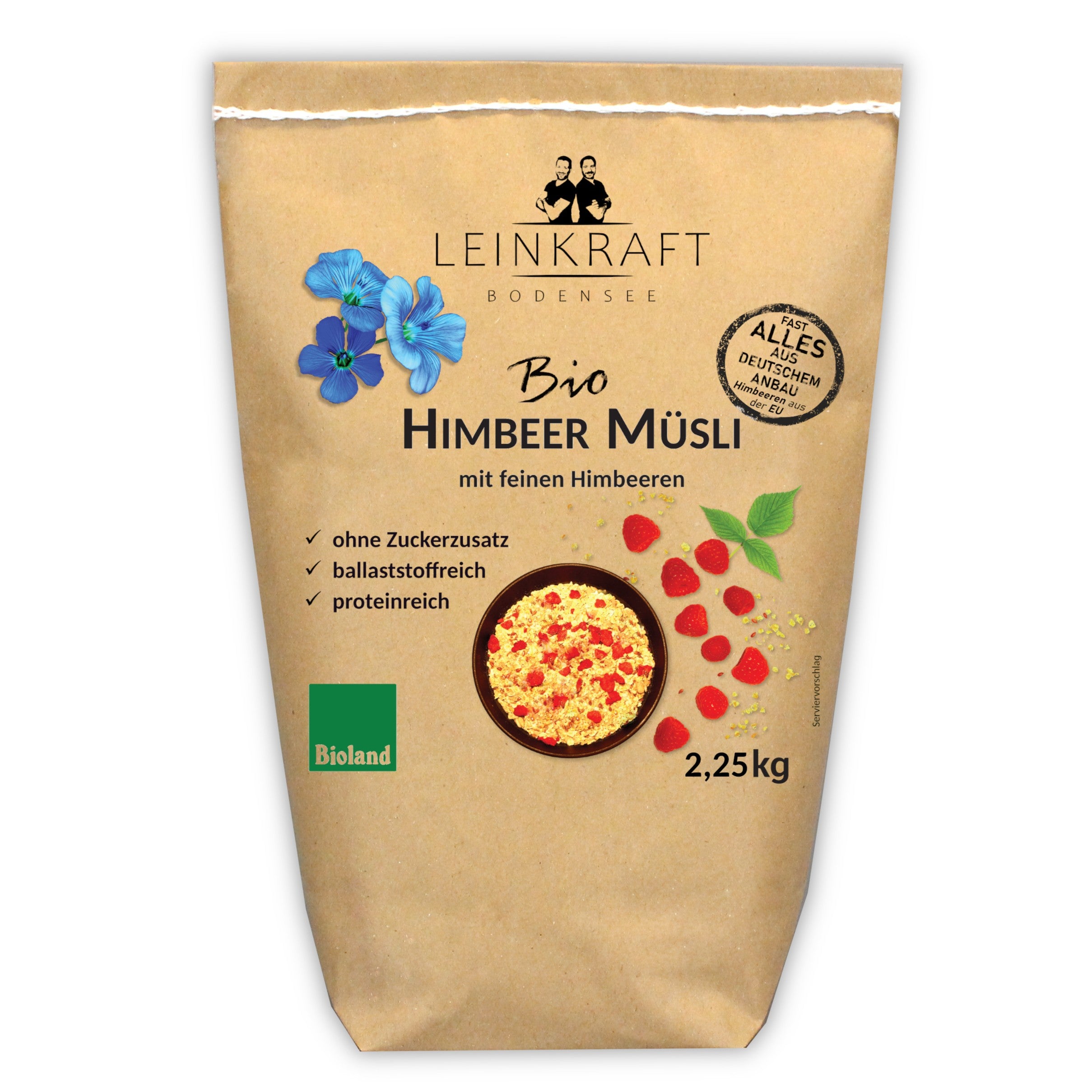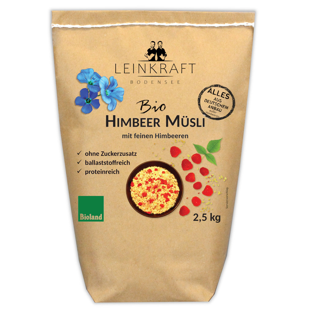 Haferflocken (Vollkorn)*, Leinsamen*, Sonnenblumenkerne*, Himbeeren*, Leinmehl* (teilentölt), Buchweizenflocken*. *aus kontrolliert biologischem Anbau