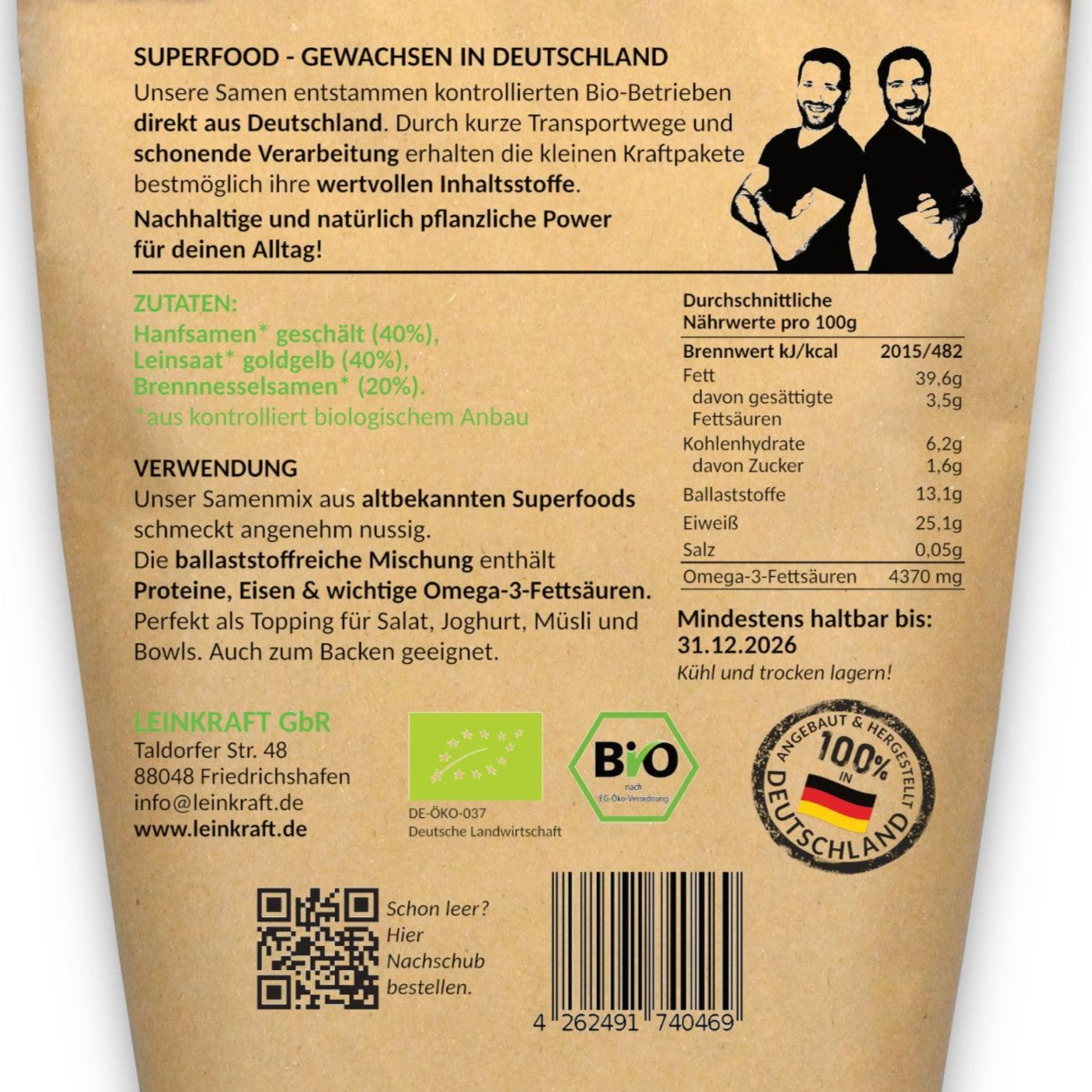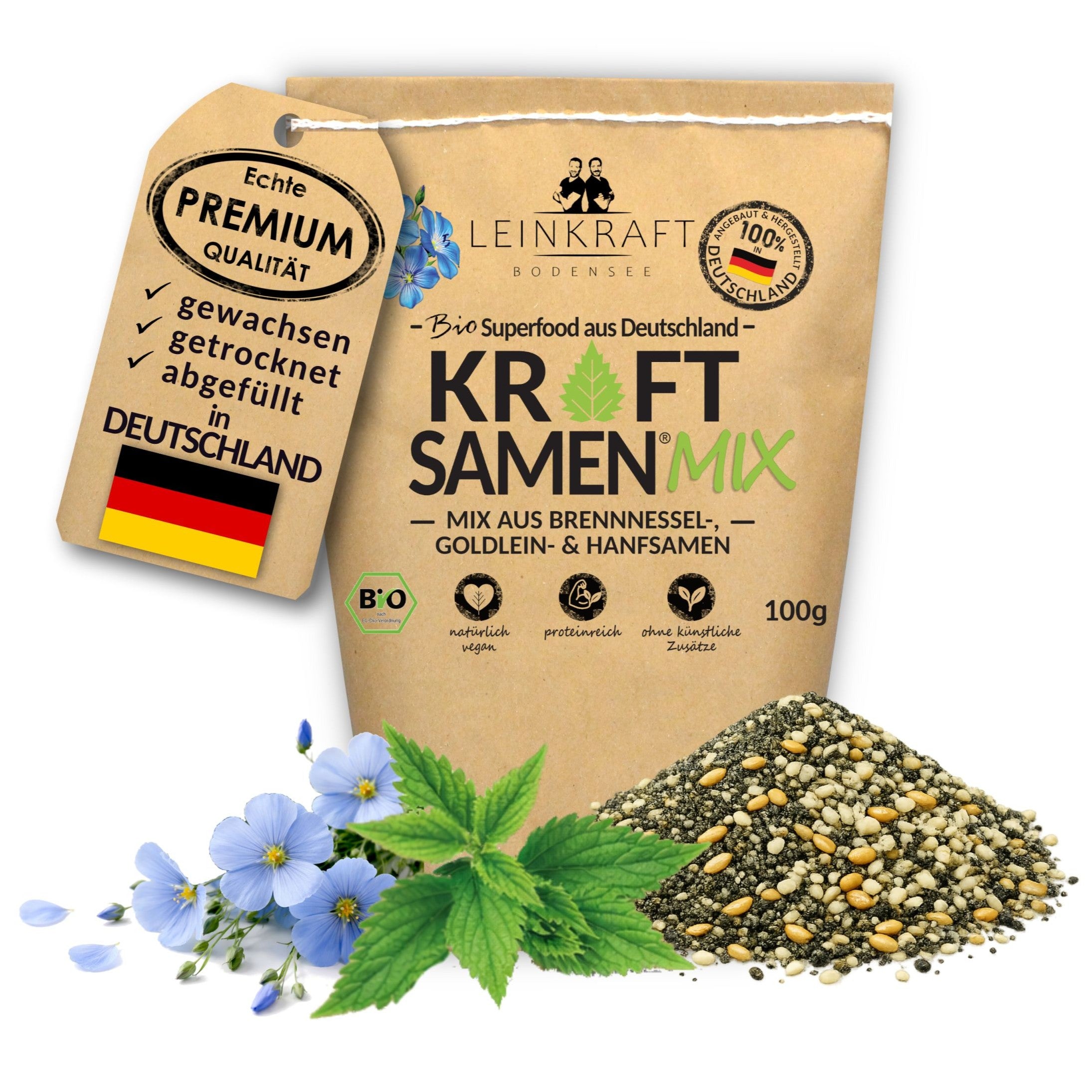 Hanfsamen geschält* 40%, Leinsamen goldgelb* 40%, Brennnesselsamen* 20% *aus kontrolliert biologischem Anbau in Deutschland