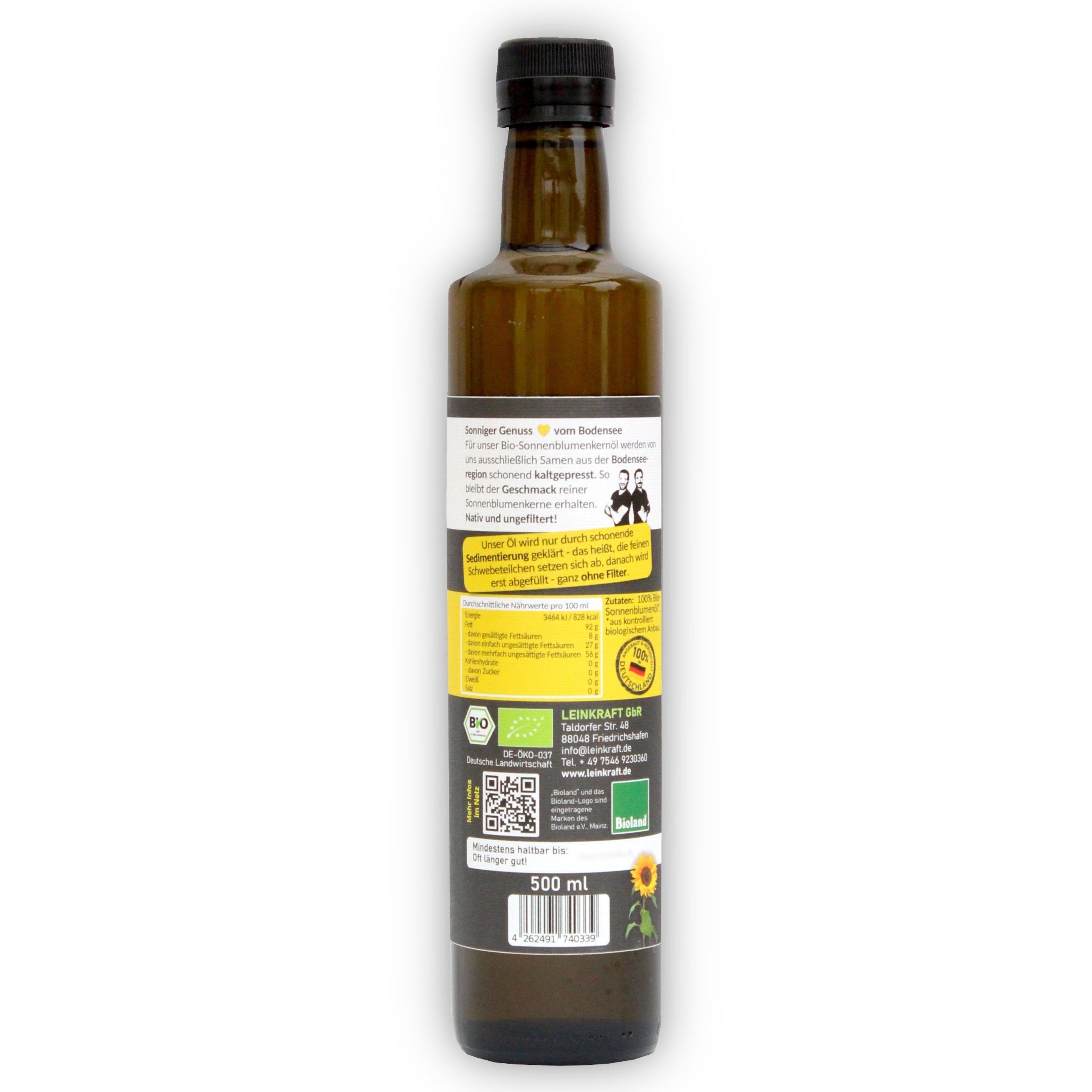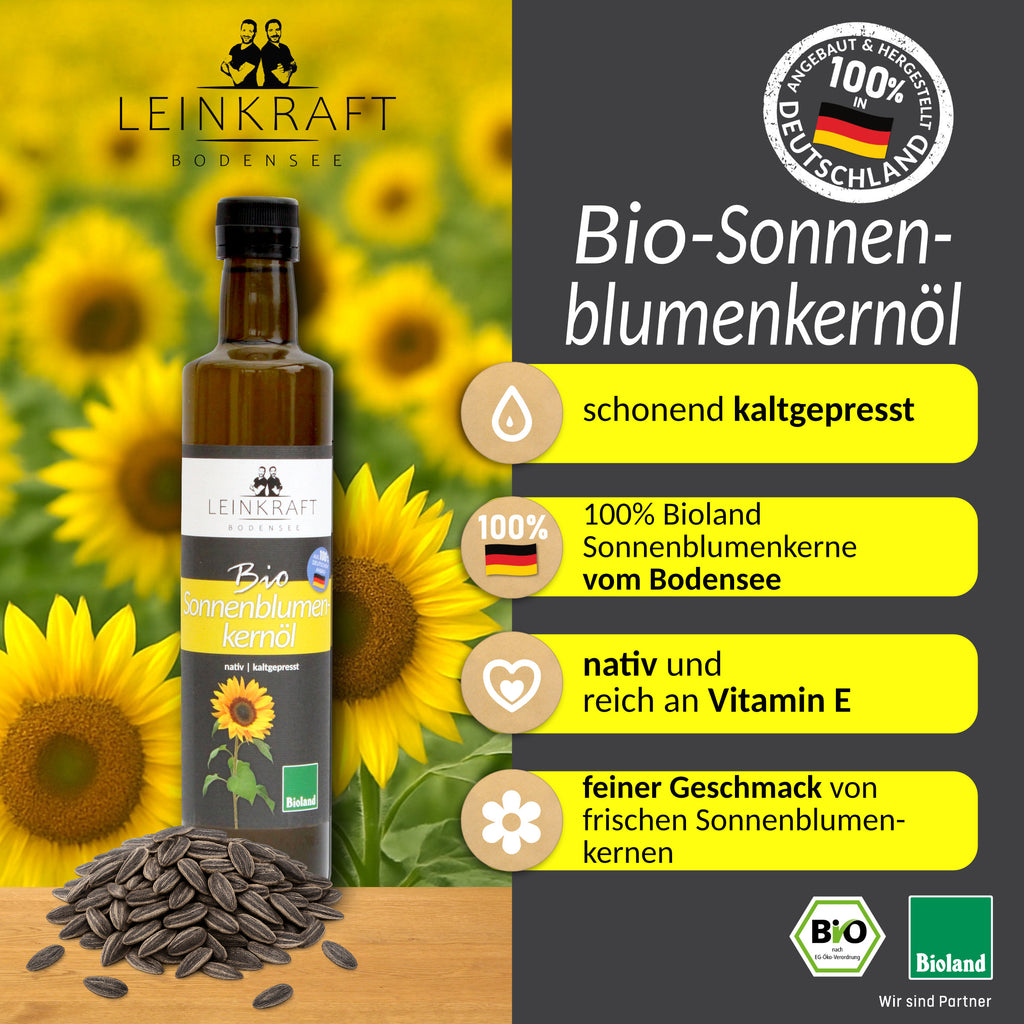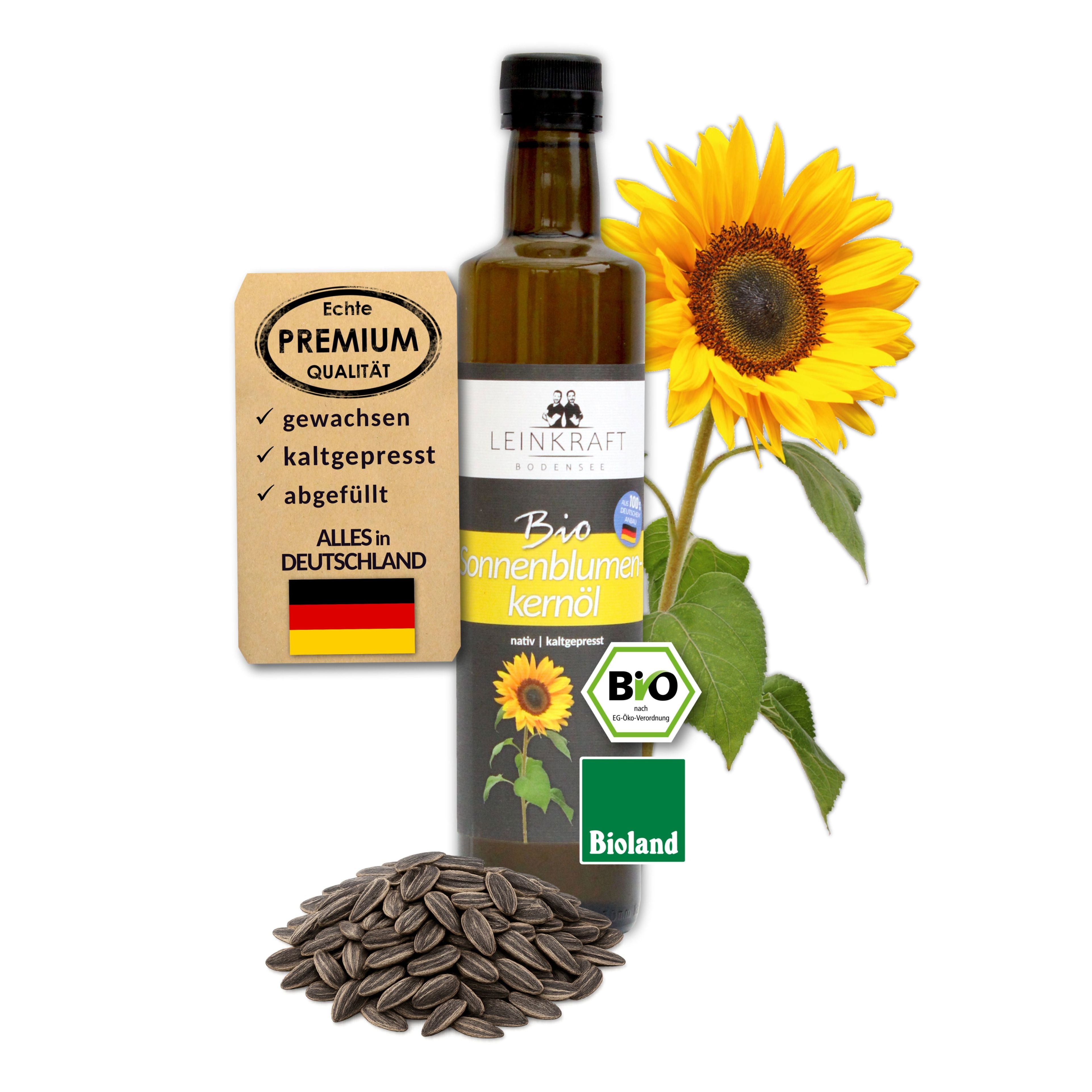 Die wertvollen Inhaltsstoffe bleiben in unserem hochwertigen Speiseöl durch die schonende Kaltpressung erhalten. Wir verwenden ausschließlich Bio-Sonnenblumenkerne vom Bodensee für unser Sonnenblumenöl.